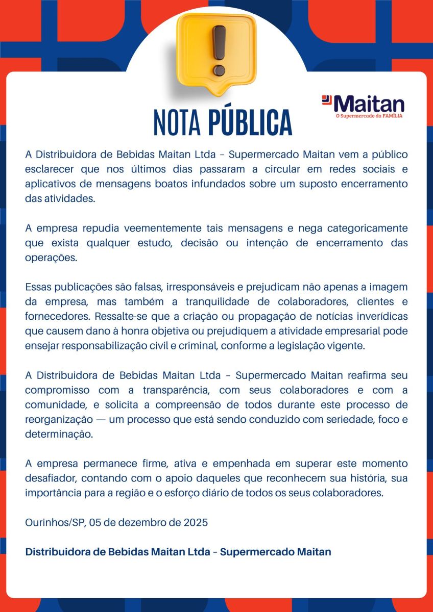 Na semana passada, o Supermercado Maitan chegou a publicar em suas redes sociais que não procedem as informações sobre um possível fechamento da empresa. Até o momento, não houve manifestação oficial da direção sobre os atrasos nos pagamentos.