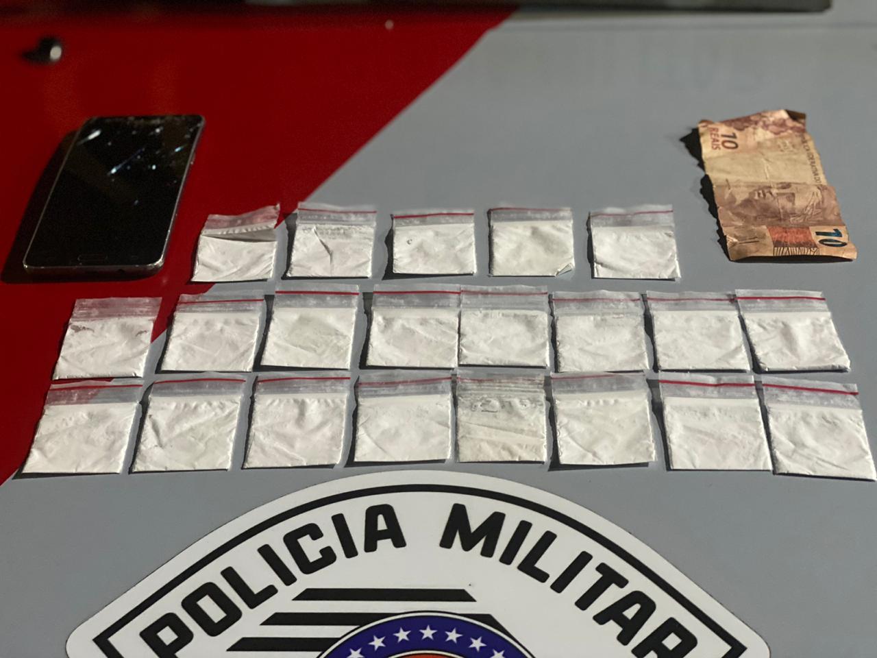 "Equipe em patrulhamento tático pelo bairro Jardim Josefina, com vistas a coibir o tráfico de drogas, ao acessar à rua José Florêncio, altura do número 54, visualizou uma pessoa conhecida nos meios policiais por envolvimento com o tráfico de drogas, sendo que este, ao avistar a equipe, adentrou a uma viela ali existente e dispensou um envelope plástico no caminho, antes de ser abordado. Submetido à busca pessoal foi localizado uma nota de R$ 10,00 no bolso traseiro de sua bermuda e um aparelho celular. Posteriormente foi constatado que no interior do invólucro dispensado, havia 21 (vinte e uma) embalagens tipo zip lock contendo substância análoga a cocaína. Conduzido ao CPJ para as providências cartorárias".