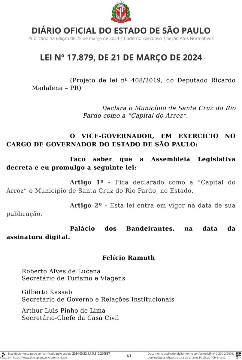 O Vice-governador Felício Ramuth, em exercício no cargo de Governador, sancionou o Projeto de Lei nº 408/2019 que declara oficialmente o município de Santa Cruz do Rio Pardo como a “Capital do Arroz” no Estado de São Paulo. A proposta, de autoria do Deputado Ricardo Madalena, foi aprovada na Assembleia Legislativa no último dia 27 de fevereiro. A decisão do Governador foi publicada na edição do Diário Oficial do dia 21 de março - Lei nº 17.879.