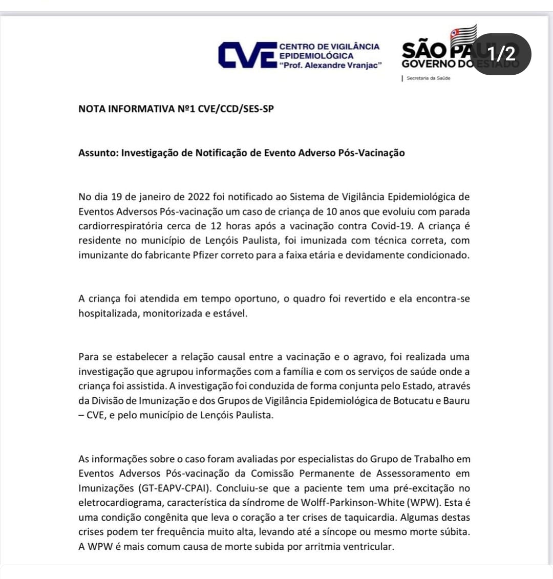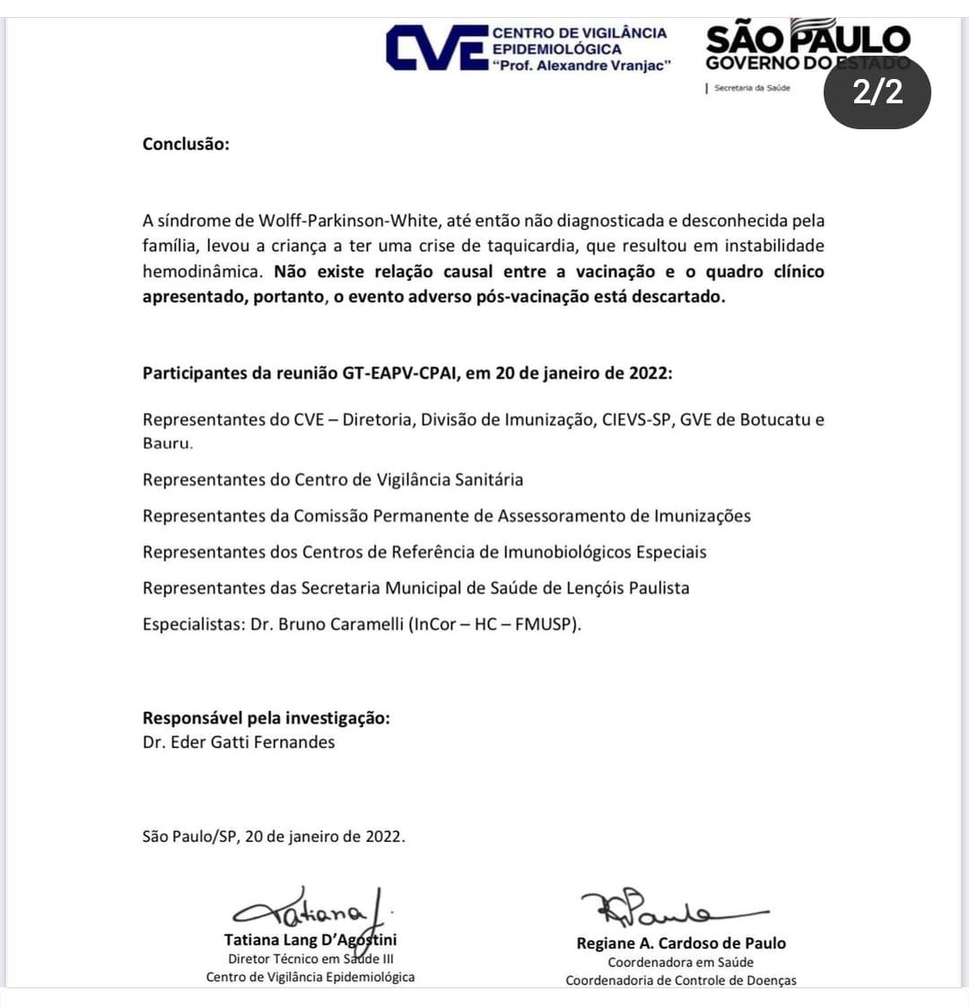 "Não existe relação causal entre a vacinação e quadro clínico apresentado. A análise realizada por mais de 10 especialistas apontou que a criança possuía uma doença congênita rara, desconhecida até então pela família, que desencadeou o quadro clínico", afirma o órgão.