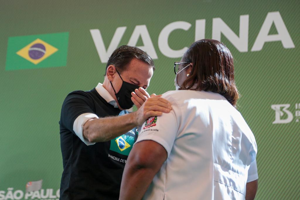 Em São Paulo, profissionais de saúde de hospitais de referência no combate à pandemia e integrantes de populações indígenas começaram a ser vacinados em uma sala dedicada do Complexo do Hospital das Clínicas da Faculdade de Medicina da USP, já no primeiro dia de campanha.