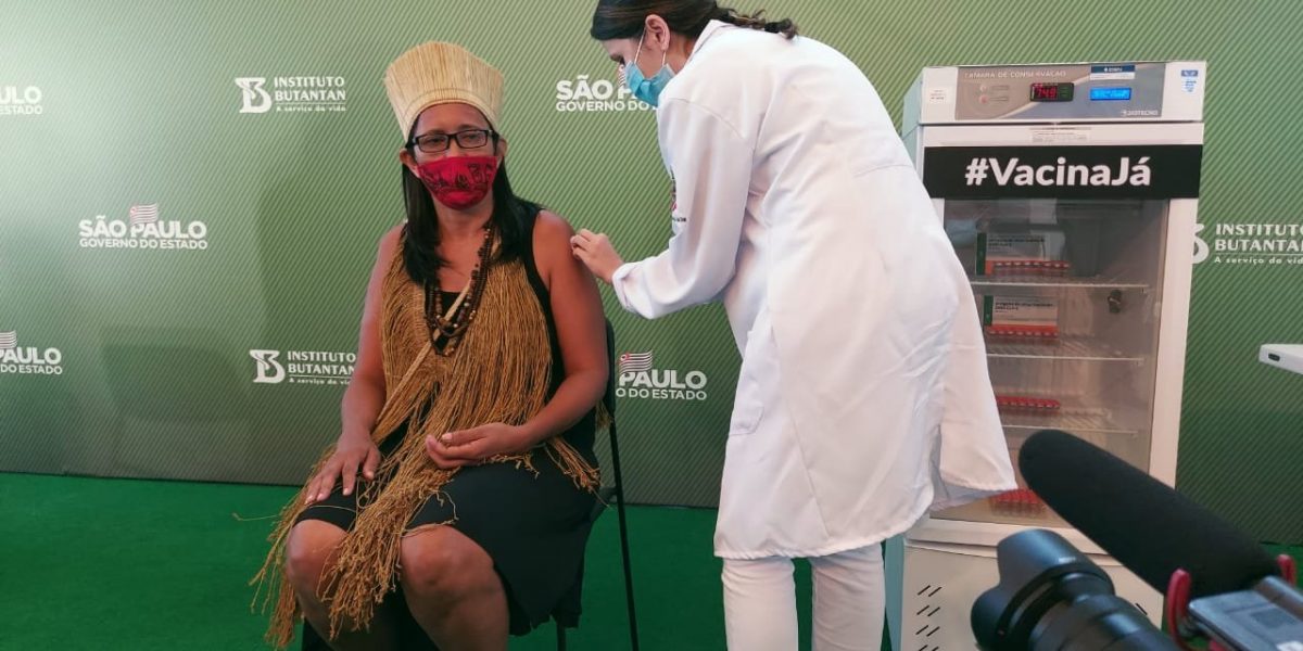 Vanuzia Costa Santos, 50, moradora da aldeia multiétnica Filhos Dessa Terra, na cidade de Guarulhos, é a primeira indígena do Brasil a se vacinar contra a COVID-19.