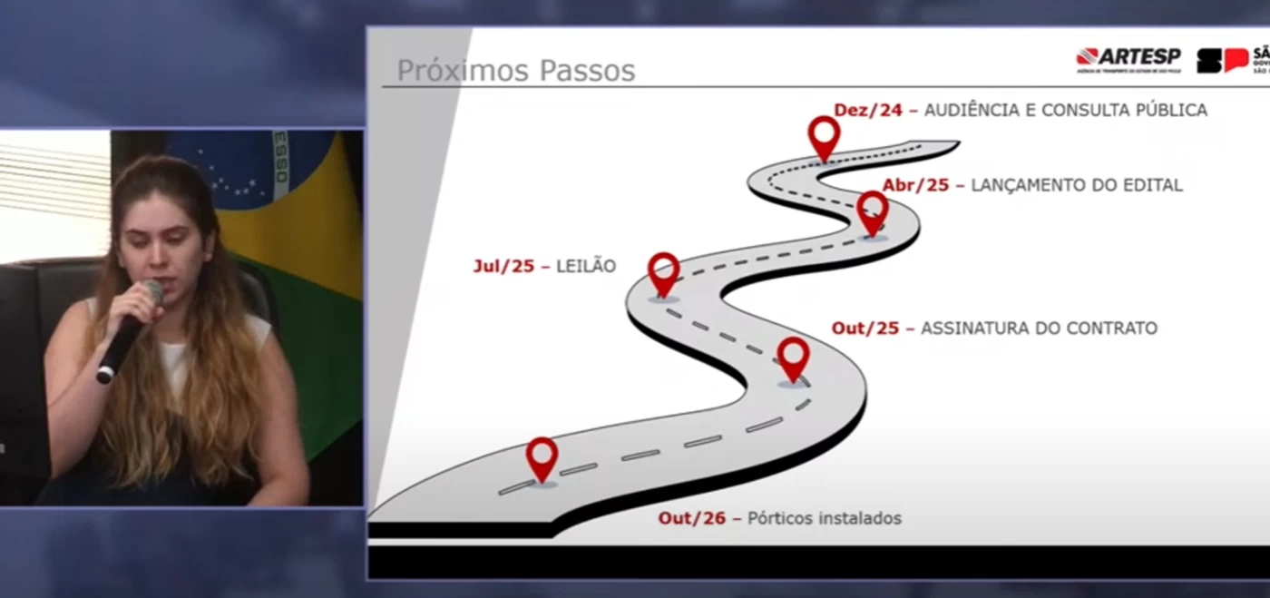 Foram apresentados cinco pedágios ou “pórticos” no trecho. O sistema será automatizado, com cobranças feitas por tag ou via meios digitais em até 15 dias. Os locais e tarifas estimadas são: