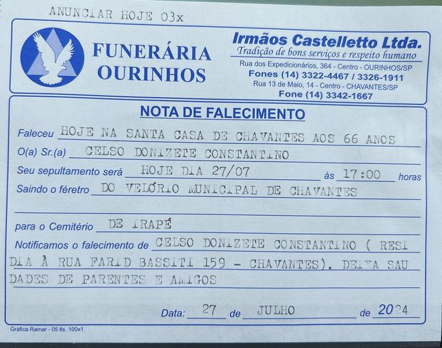 Faleceu em Chavantes (SP), neste sábado, 27, Celso Donizete Constantino, de 66 anos. O velório está sendo realizado no velório municipal de Chavantes, e o sepultamento está marcado para hoje, às 17h, no Cemitério Irapé, em Chavantes.