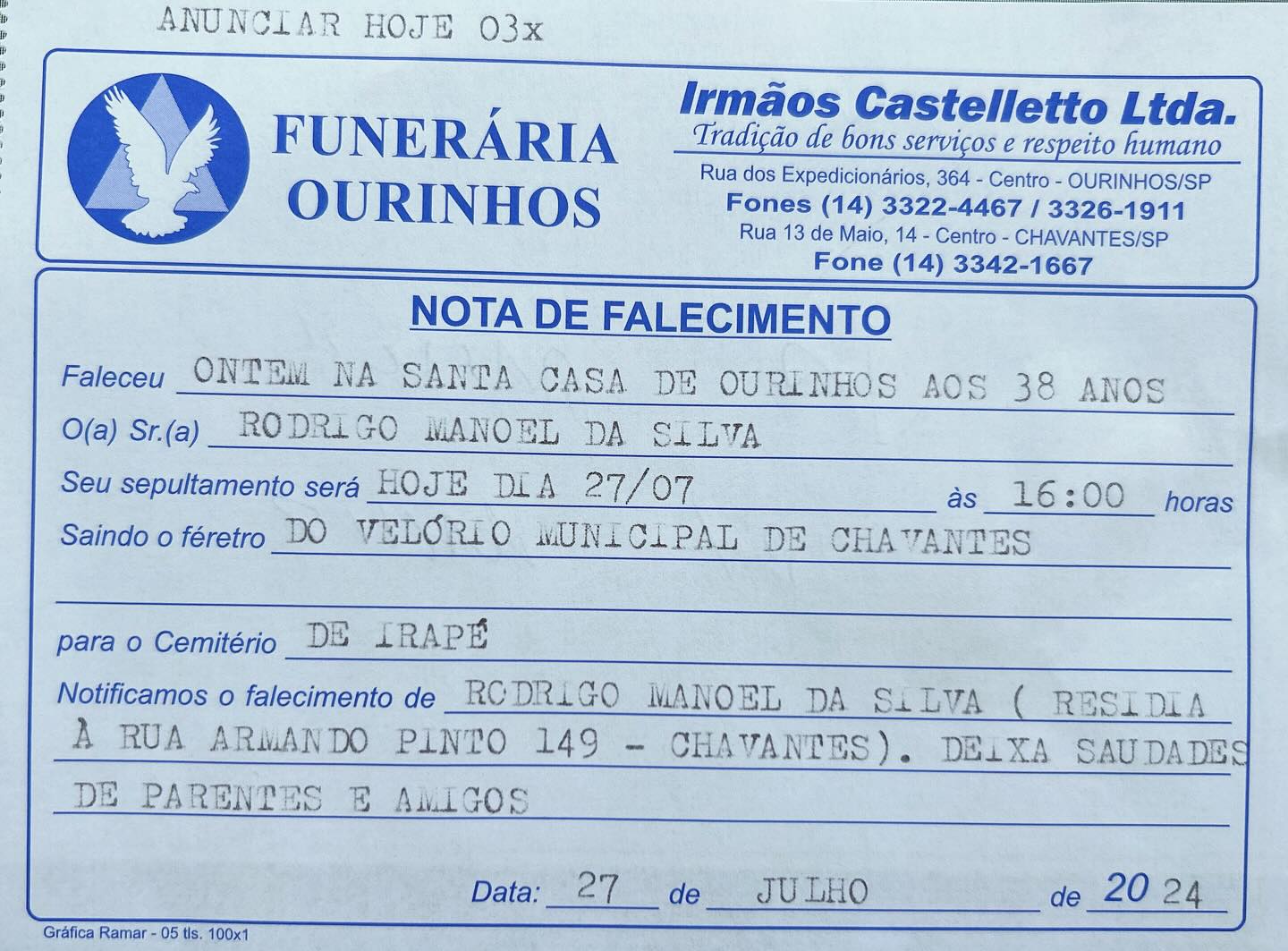 Faleceu nesta sexta-feira, 26, na Santa Casa de Ourinhos (SP), Rodrigo Manoel da Silva, de 38 anos. O velório está acontecendo no velório municipal de Chavantes, e o sepultamento será realizado hoje, às 16h, no Cemitério Irapé, em Chavantes.
