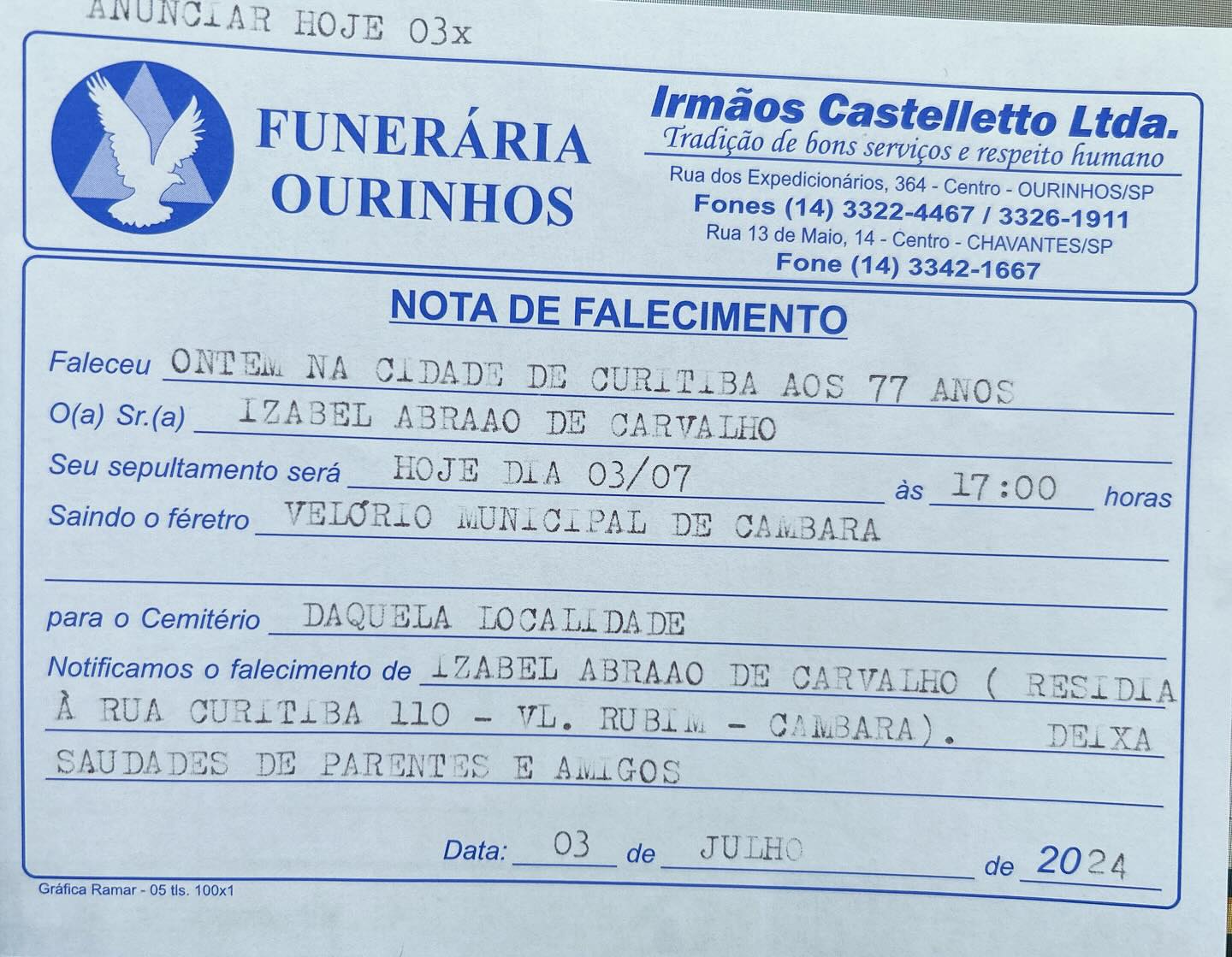 Izabel Abraão de Carvalho, de 77 anos, faleceu e está sendo velada no Velório Municipal de Cambará. O sepultamento será realizado hoje, 3 de julho, às 17h, no Cemitério Municipal de Cambará.