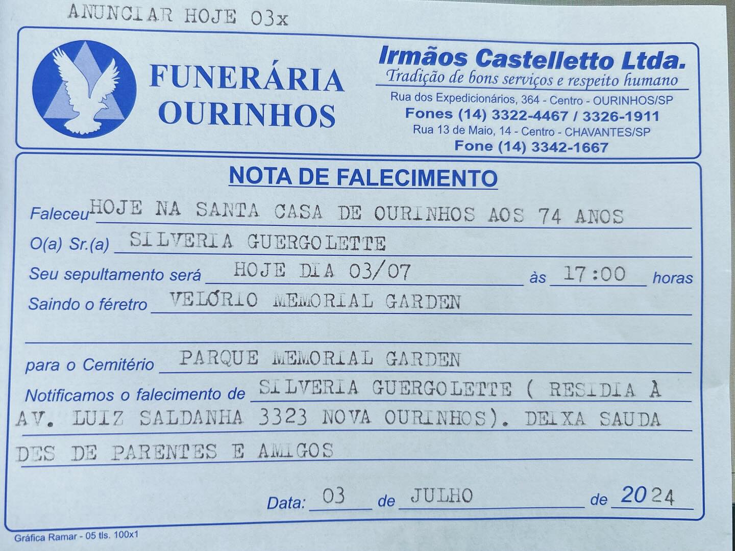 Silvéria Guergolette, de 74 anos, está sendo velada no Memorial Garden em Ourinhos. O sepultamento será hoje, 3 de julho, às 17h, no Cemitério Parque Memorial Garden de Ourinhos.