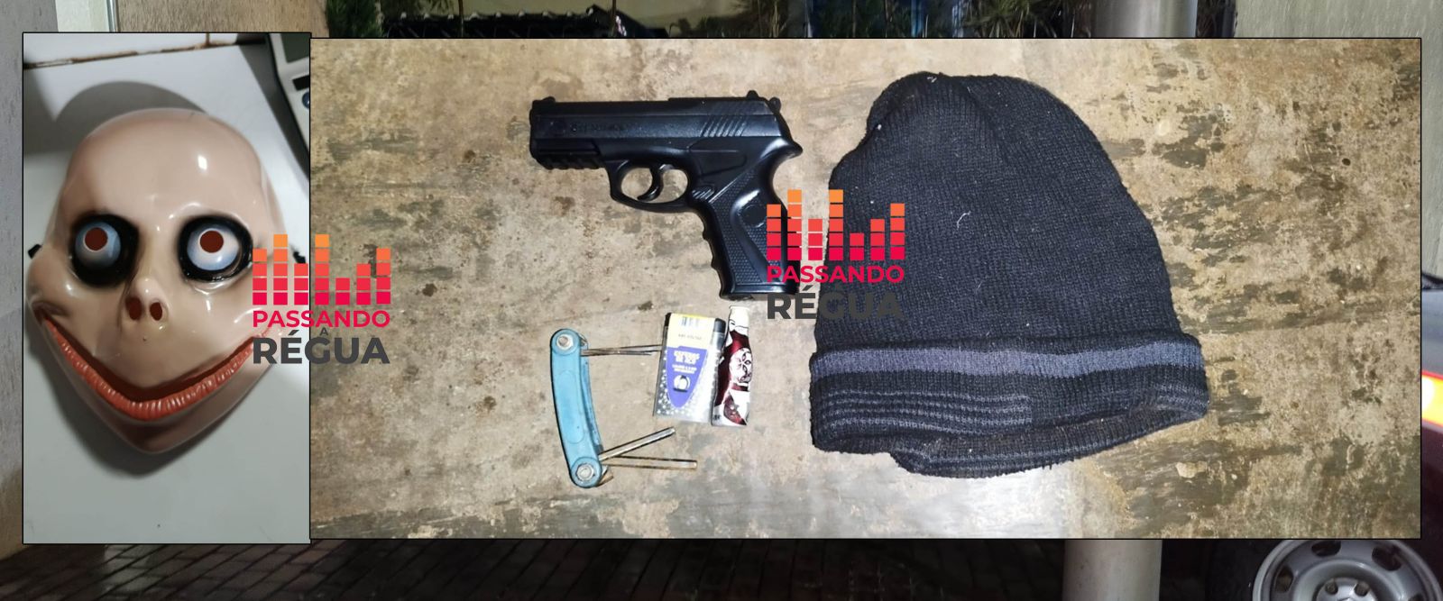 Na revista pessoal, foi localizada na cintura do suspeito uma pistola de pressão por CO2, modelo Rossi C11, calibre 4,5 mm, que possui aparência semelhante a uma arma de fogo real. O homem também utilizava um gorro preto e carregava uma bolsa azul com a inscrição “Adidas”. Dentro da bolsa, os policiais encontraram um conjunto de chaves mixa, uma caixa de esferas de aço calibre 4,5 mm e seu documento de identidade. Próximo ao suspeito, no chão, também foi localizada uma máscara de cor bege.