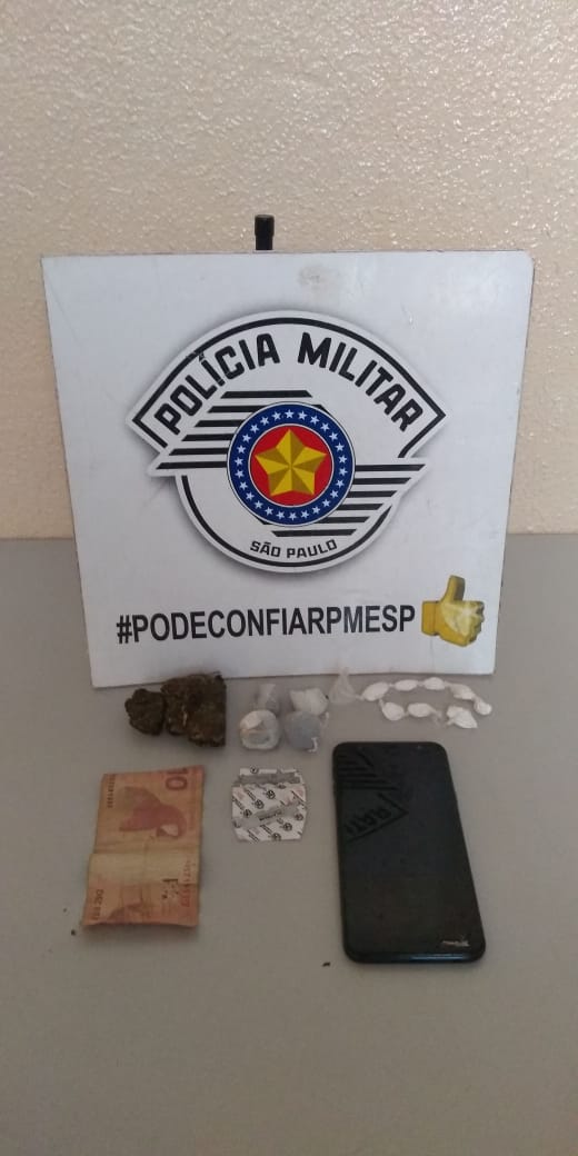 "Em patrulhamento juntamente visualizou se o detido na prática do tráfico de drogas, entregando uma porção de drogas para uma mulher, sendo localizado em sua bolsa uma porção de maconha, ato contínuo foi abordado detido , e com ele foram localizados duas porções de maconha, bem como oito porções de cocaína, ambas já embaladas para venda, e a quantia de R$ 10,00 reais em espécie. Conduzido à CPJ".