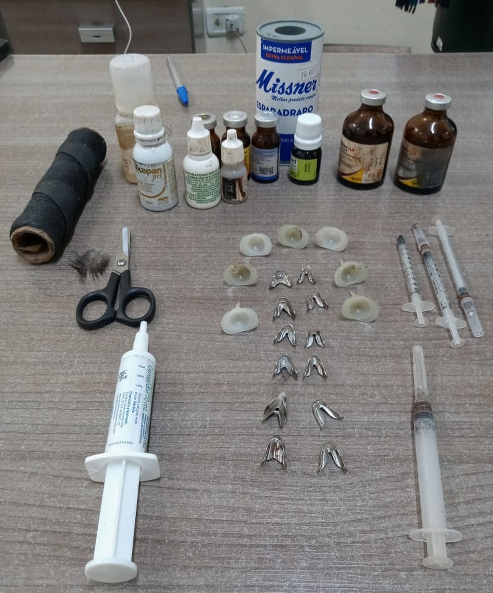 Materiais e medicamentos para tratar os animais feridos nas brigas também foi apreendido: crime ambiental — Foto: Polícia Ambiental/Divulgação