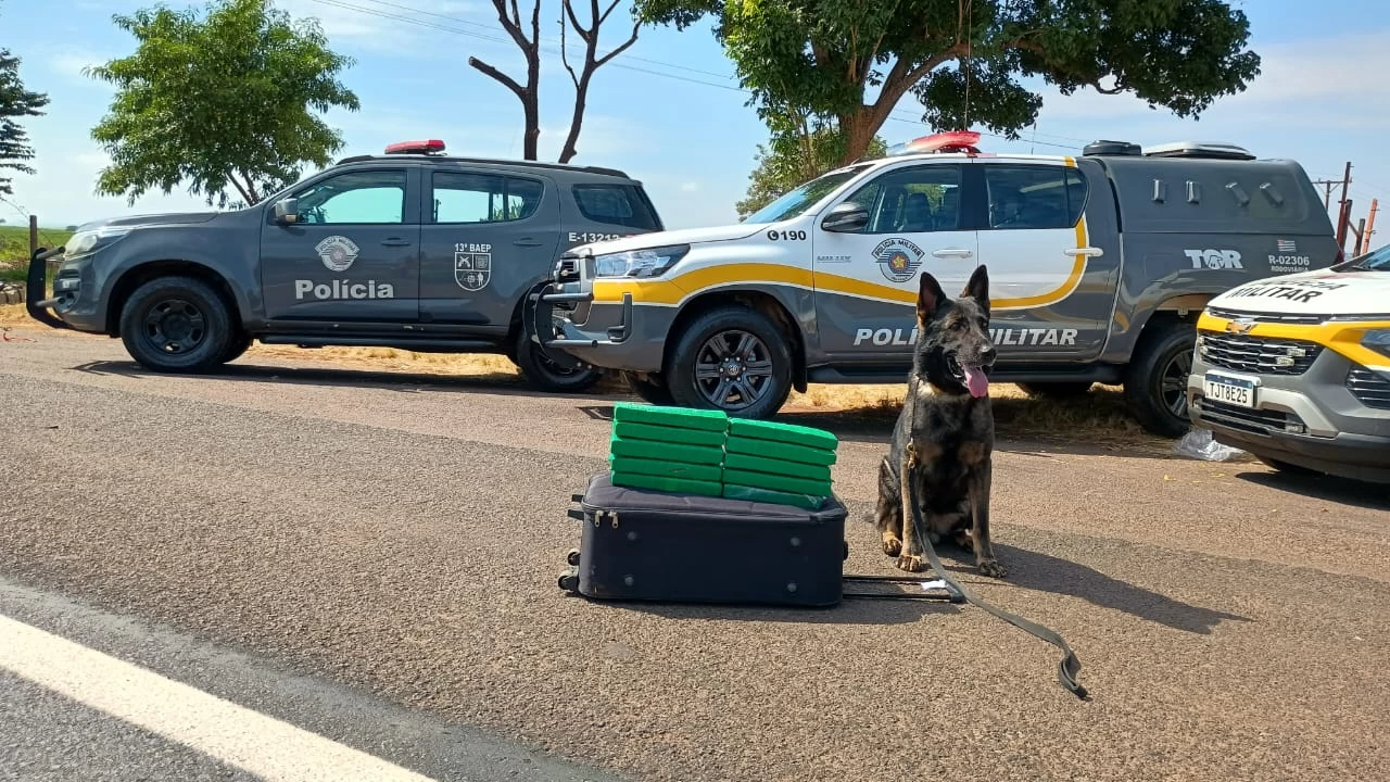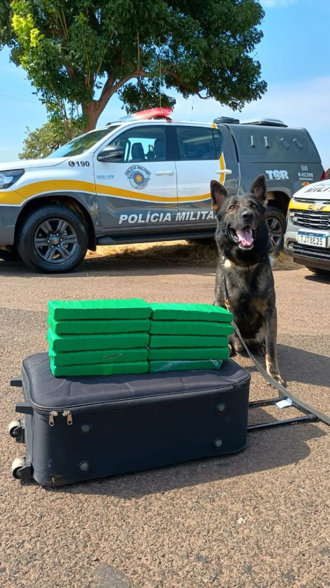 Durante a vistoria no compartimento de bagagens, o cão farejador Grey indicou a possível presença de entorpecentes em uma das malas. Após uma busca minuciosa, os policiais localizaram 10 tabletes de maconha escondidos na bagagem, totalizando 7,917 quilos da droga.