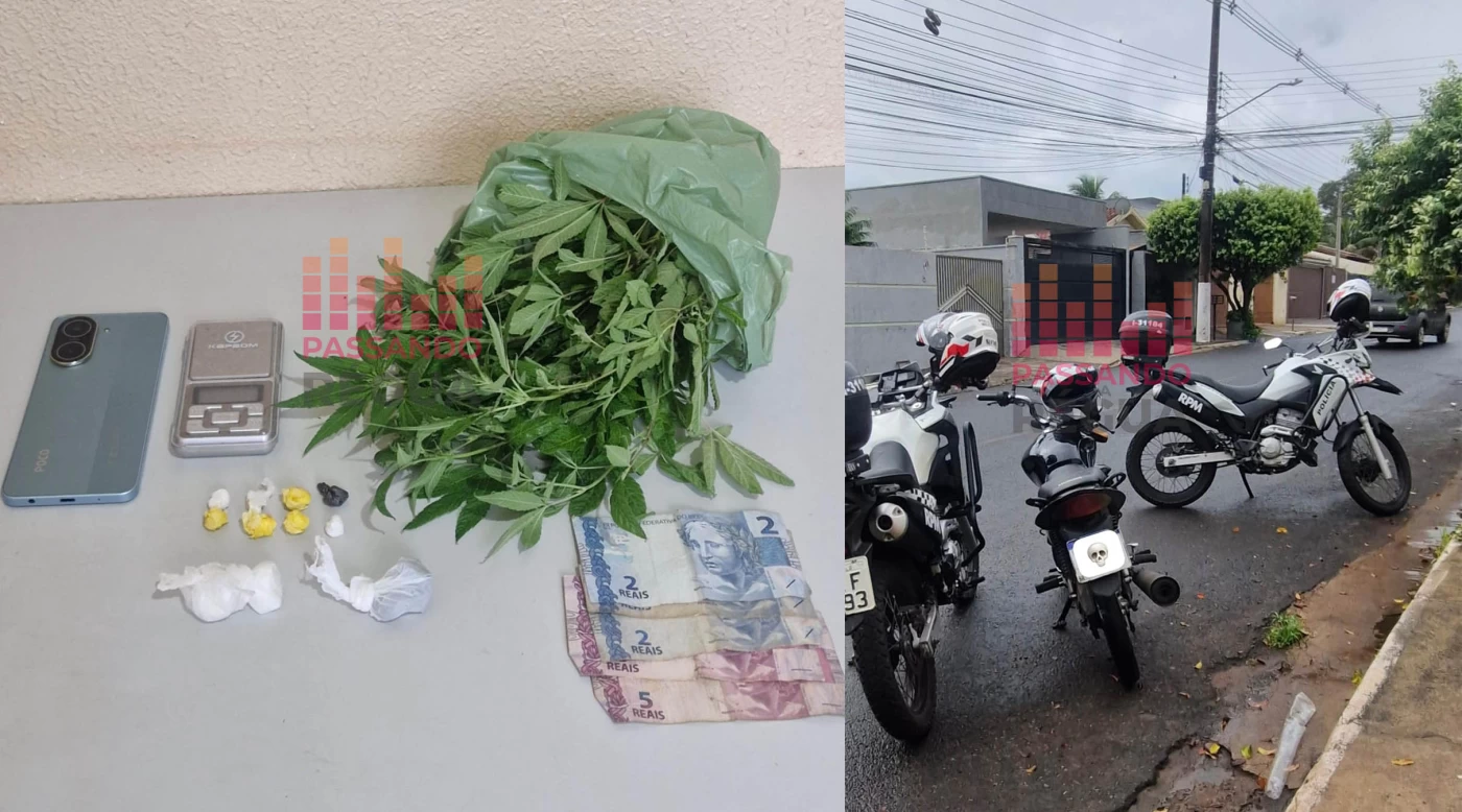 No interior da residência, os policiais localizaram, em um dos quartos, uma porção maior de cocaína, uma porção de maconha e uma balança de precisão. Já na cozinha, foi encontrada uma sacola contendo 16 galhos verdes com folhas semelhantes à maconha que estavam sendo deixadas para secagem.