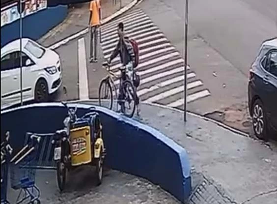 Imagens das câmeras de segurança do estabelecimento registraram toda a ação. Nas filmagens, é possível ver o suspeito dentro do mercado, saindo rapidamente e levando a bicicleta da menina.