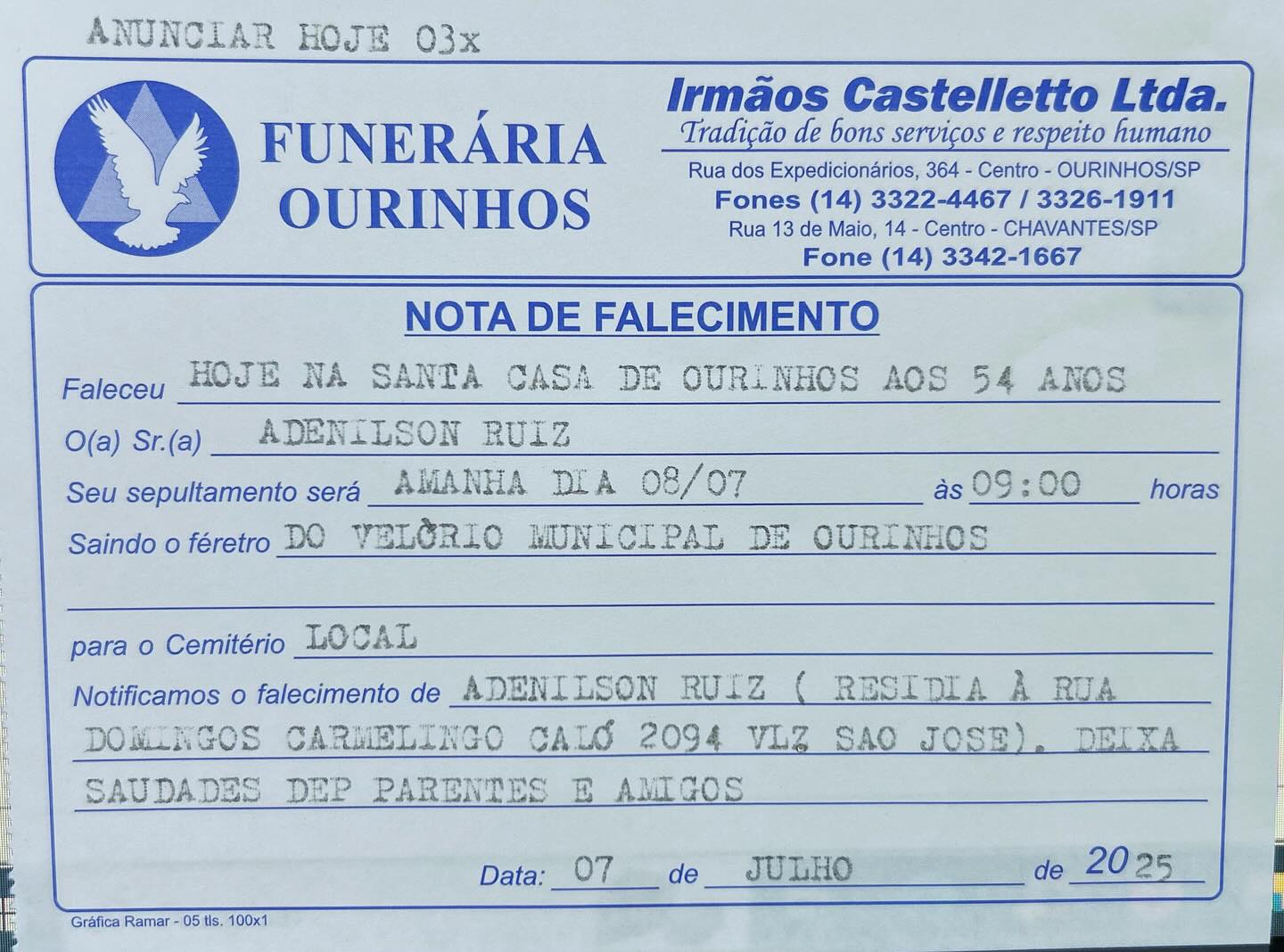 Adenilson Ruiz, de 54 anos, morreu na madrugada desta segunda-feira, 7 de julho, em Ourinhos (SP), após sofrer uma grave queda de um caminhão. A data exata da queda não foi divulgada pelas autoridades.