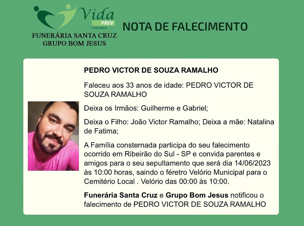 É sepultado em Santa Cruz do Rio Pardo, na manhã desta quarta-feira, 14, Pedro Victor de Souza Ramalho, de 33 anos, que faleceu nesta terça-feira, 13, em gravíssimo acidente na Rodovia Transbrasiliana, a BR-153, em Ribeirão do Sul (SP). Pedro deixa o filho e a mãe. Relembre o acidente no vídeo abaixo.