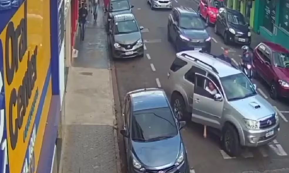 Segundo a Polícia Militar, o crime foi denunciado pelo marido da vítima. Imagens de câmeras de segurança mostram o momento em que o suspeito abre a porta do veículo e assume a direção, enquanto a mulher tenta sair, mas é impedida. Ela fica pendurada na porta antes de o carro partir em alta velocidade.