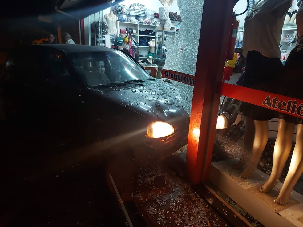 De acordo com a Polícia Militar, dois homens estavam brigando no meio da rua quando o parente de um deles tentou atropelar o outro envolvido. O carro acabou acertando uma loja de roupas, que ficou com a vitrine totalmente destruída.