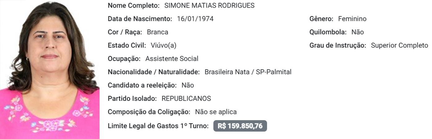 | SIMONE MATIAS | REPUBLICANOS | 10 | Concorrendo |