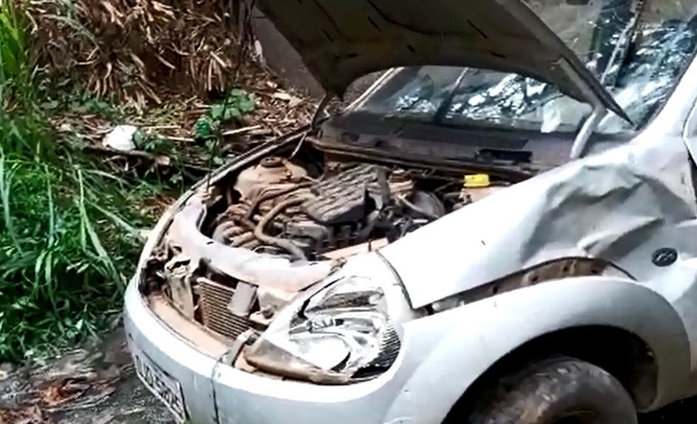 Carro ficou com a frente destruída após a queda na avenida de Marília — Foto: Polícia Militar/ Divulgação