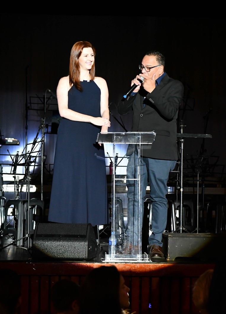 A diretora pedagógica do Colégio Santo Antônio, Narda Jorosky, e o comunicador Edu Bala foram os mestres cerimônias do espetáculo.