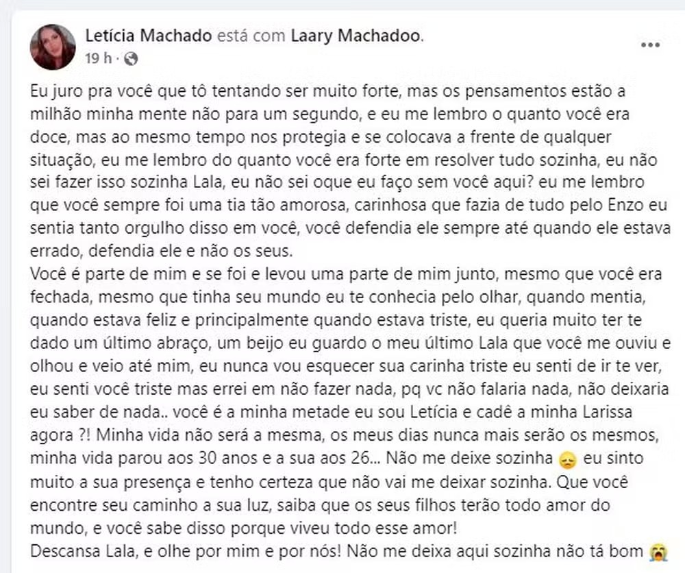 Nas redes sociais, Letícia Machado compartilhou sua dor ao relembrar a irmã, mãe de dois filhos, e lamentou não ter conseguido ajudá-la a tempo. "Que você encontre seu caminho e sua luz. Saiba que seus filhos receberão todo o amor do mundo, e você sabe disso, porque viveu esse amor!", escreveu Letícia. Ela também relatou ter percebido que Larissa estava triste nos últimos dias, provavelmente por causa dos boatos sobre sua saúde. "Nunca vou esquecer sua carinha triste quando fui te ver. Senti que você estava mal, mas errei ao não fazer nada, pois você não falaria sobre isso e não deixaria eu saber", desabafou.
