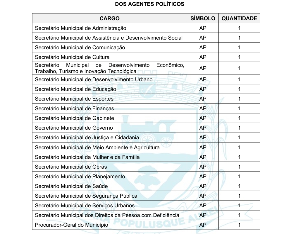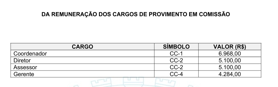 O número de secretários será mantido em 21, incluindo o Procurador-Geral do Município. Porém, não existirão mais os cargos de secretário-adjunto, criados na gestão anterior. Em contrapartida, cada secretaria terá um coordenador, com salário de R$ 6.968,00. Os demais cargos comissionados serão de diretor e assessor (R$ 5.100,00) e gerente (R$ 4.284,00).