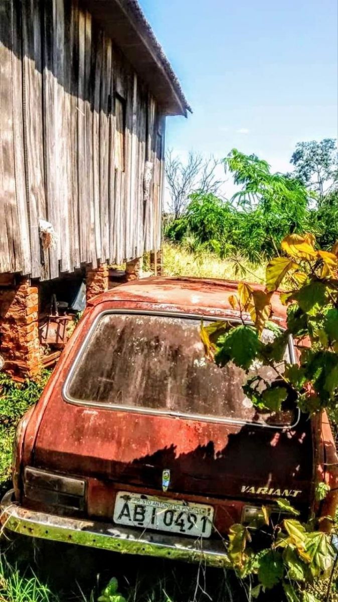 Atrás da casa, também em situação de abandono, um carro da Volkswagen, vermelho desbotado, tal qual uma camiseta dependurada no varal.