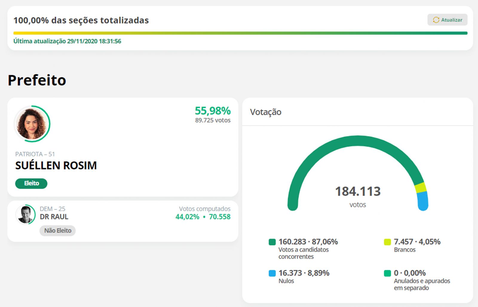 Ela recebeu 89.725 votos, o que corresponde a 55,98% dos votos válidos. Dr. Raul (DEM), candidato derrotado, teve 70.558 votos, o equivalente a 44,02% dos votos válidos.