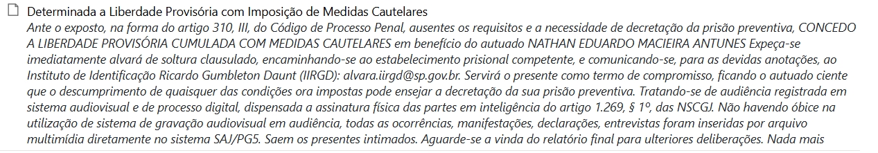 De acordo com o despacho judicial, o juiz entendeu que não estavam presentes os requisitos legais para a decretação da prisão preventiva e determinou a soltura de Nathan Eduardo Macieira Antunes, com imposição de medidas cautelares. O alvará de soltura foi expedido, e o acusado deverá cumprir as condições estabelecidas pela Justiça, podendo voltar a ser preso caso descumpra as determinações.