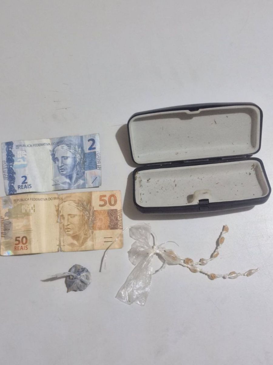 Durante a revista pessoal, os policiais localizaram na cintura do suspeito, posteriormente identificado como Eduardo dos R. C., uma caixinha de óculos contendo 11 pedras de uma substância semelhante a crack, todas fracionadas e prontas para venda, além de uma porção de substância aparentando ser maconha. No bolso da calça também foram encontrados R$ 52 em dinheiro.