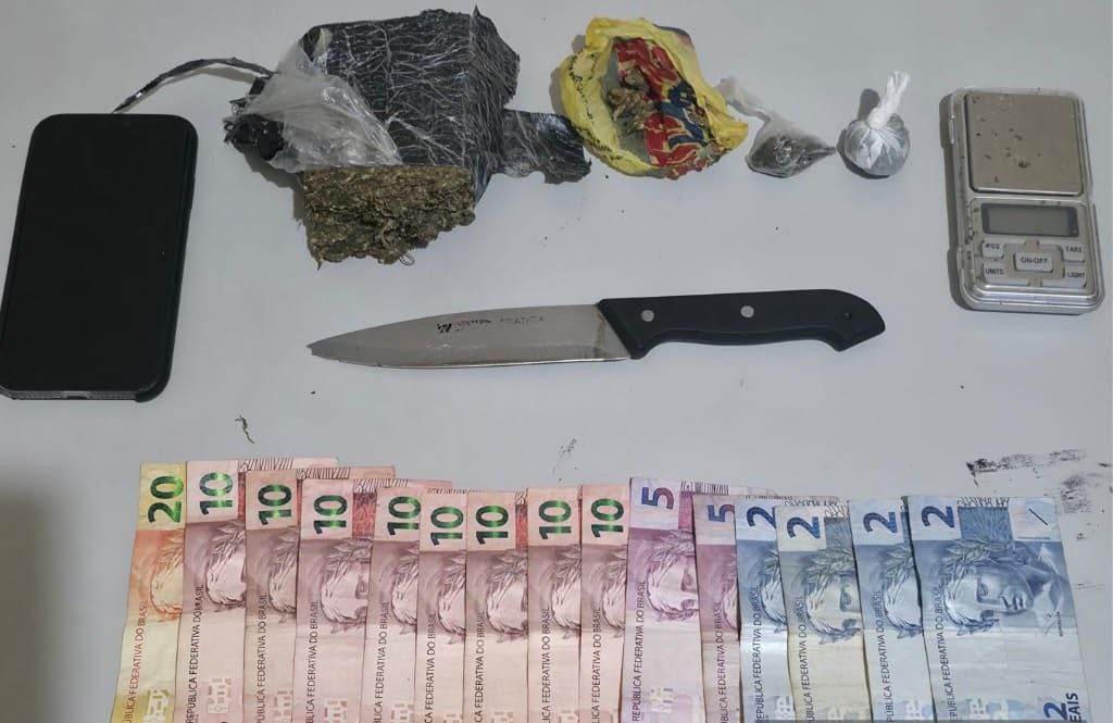 Em situação de flagrante delito, a equipe ingressou no imóvel e localizou ainda um invólucro plástico contendo três porções de maconha e a quantia de R$ 118 em dinheiro. Também foram constatados resquícios da droga na faca e na balança de precisão. O abordado foi identificado como Diogo G. V. dos S., que confessou aos policiais a prática do tráfico de drogas. Ele afirmou que havia acabado de vender uma porção de maconha ao ocupante do veículo Gol e que receberia o pagamento via Pix.