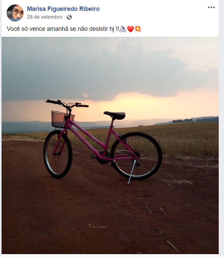 A última publicação da jovem em sua rede social no Facebook foi justamente a foto de sua bicicleta (foto: Reprodução)
