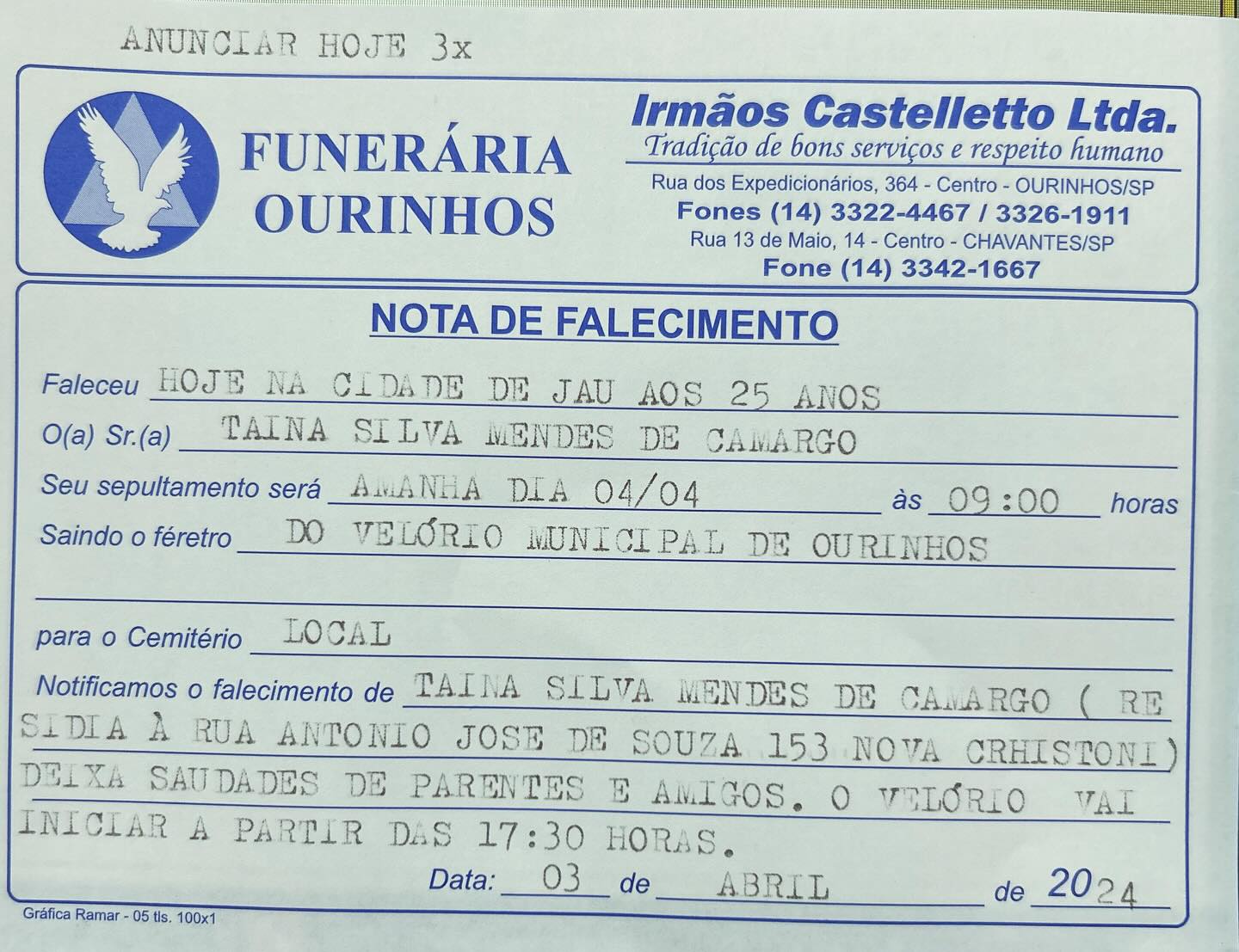 Uma jovem de 25 anos faleceu, na madrugada desta quarta-feira, 3, após lutar contra o câncer em Ourinhos. Tainá Silva Mendes de Camargo (foto acima) é natural de Cambará (PR), mas morava na Barra Funda em Ourinhos. Será velada a partir das 17h30, no Velório Municipal de Ourinhos (SP) e será sepultada amanhã às 9h, Cemitério Municipal de Ourinhos (SP).
