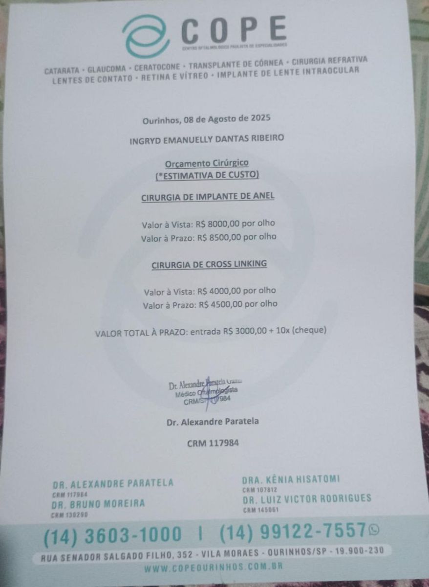 O orçamento cirúrgico apresentado pela família indica que cada implante de Anel de Ferrara custa R$ 8.000,00 à vista (R$ 8.500,00 a prazo) e o Crosslinking, R$ 4.000,00 à vista (R$ 4.500,00 a prazo). O valor total estimado para o tratamento, se pago à vista, é de R$ 25.000,00. No caso de parcelamento, a entrada é de R$ 3.000,00 mais dez cheques.