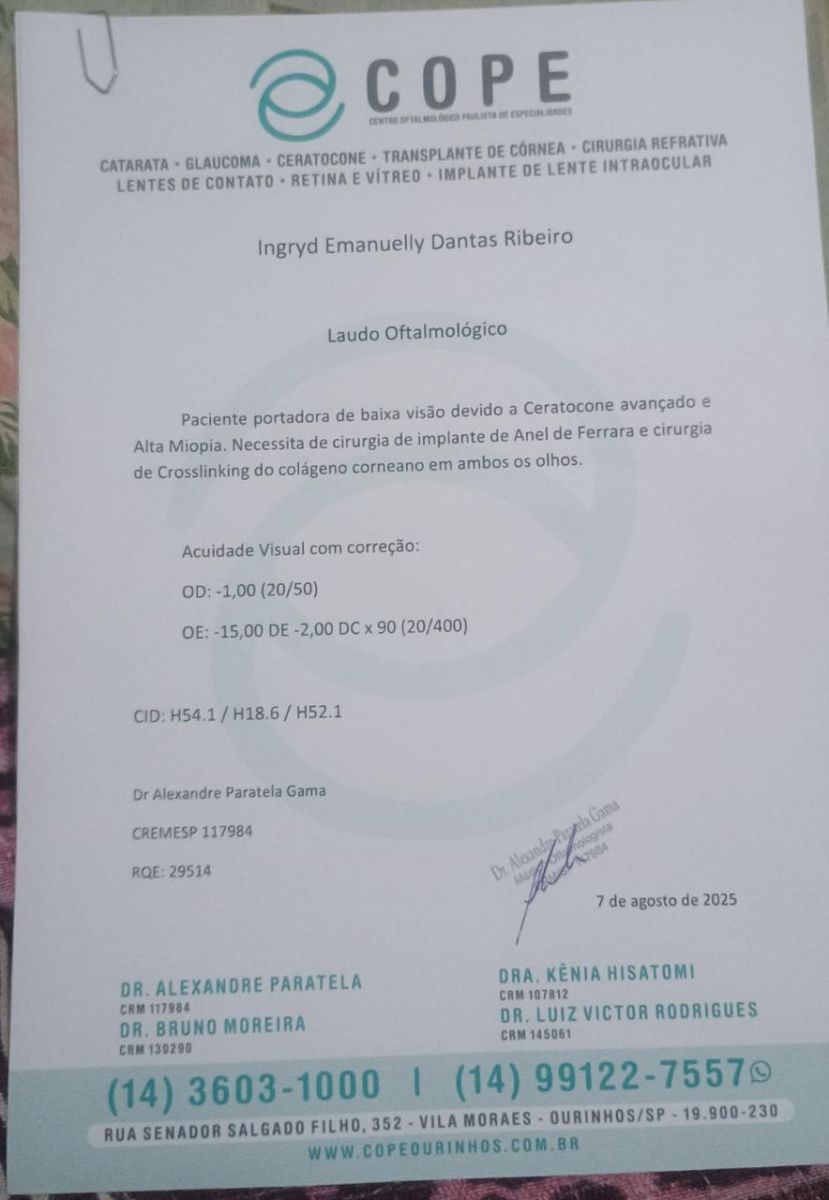 De acordo com laudo assinado pelo oftalmologista Dr. Alexandre Paratela, Ingryd apresenta baixa visão e necessita de dois procedimentos: o implante de Anel de Ferrara e a cirurgia de Crosslinking do colágeno corneano, ambos em cada olho.