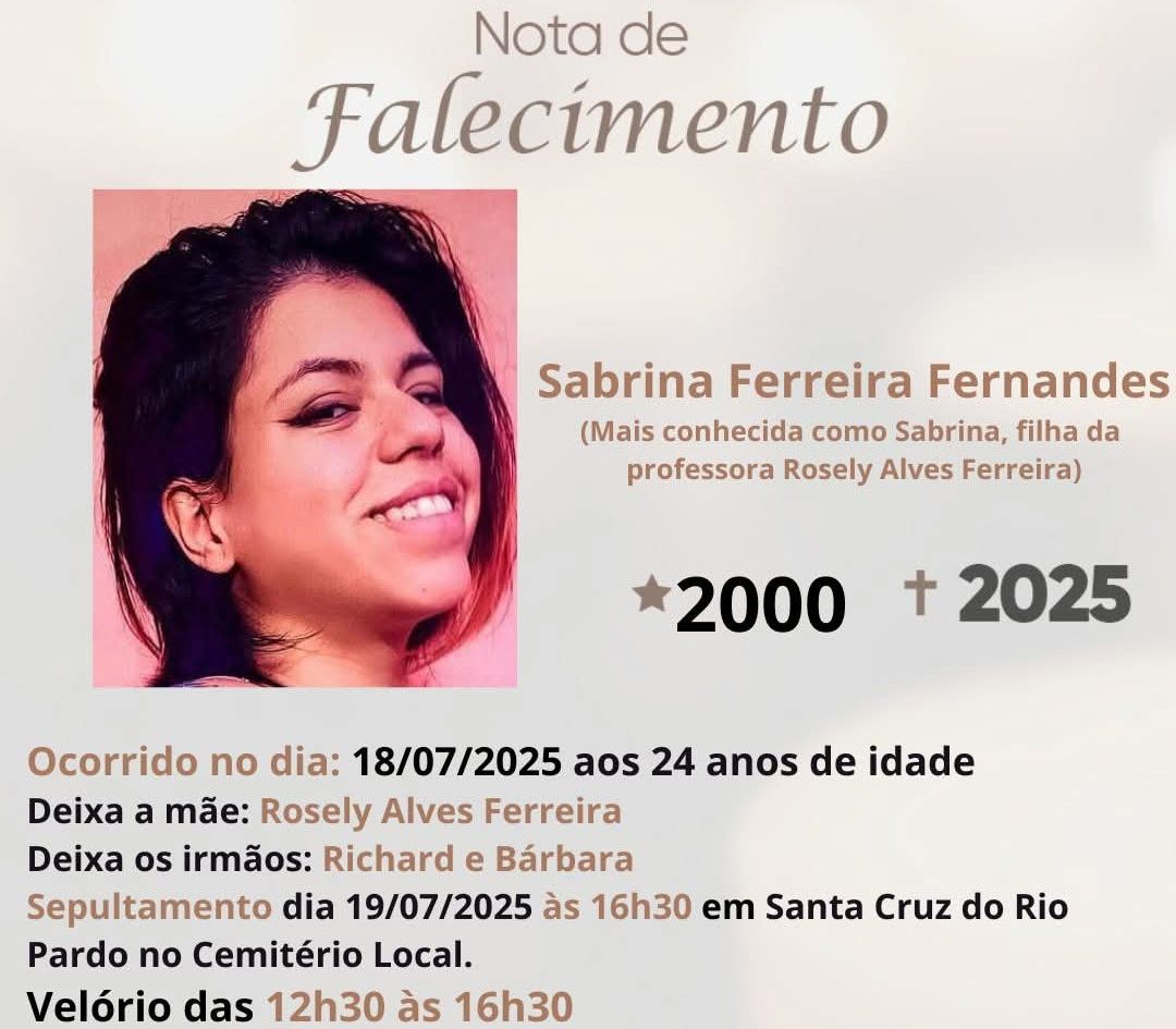 Uma tragédia abalou os moradores de Santa Cruz do Rio Pardo (SP) na noite da última sexta-feira (18). A jovem Sabrina Ferreira Fernandes, de 24 anos, foi encontrada morta dentro da residência onde vivia, nos fundos da casa da mãe, nas proximidades do Postão de Saúde, na região central da cidade. A vítima estava grávida de aproximadamente seis a sete meses.