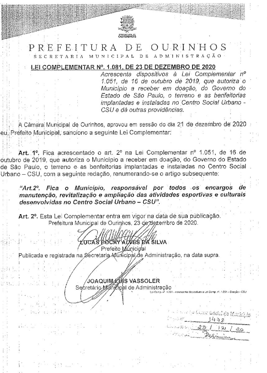 A Câmara Municipal de Ourinhos aprovou a Lei Complementar nº 1.081, de Dezembro de 2020, que autoriza o município a receber a área do CSU como doação por parte do Governo de SP, ficando a Prefeitura responsável por todos os encargos de manutenção, revitalização e ampliação das atividade esportivas e culturais no local. Apesar da aprovação na Câmara, a Prefeitura alega que depende do Governo do Estado realizar a transferência definitiva da área para iniciar algum tipo de melhoria no local, enquanto isso o CSU é dominado por traficantes.