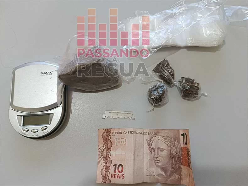Os policiais realizaram vistoria no local indicado e encontraram uma sacola plástica com uma porção bruta de maconha, além de três porções menores embaladas e prontas para venda, uma balança de precisão, uma lâmina do tipo gilete e vários saquinhos plásticos utilizados para embalar drogas.