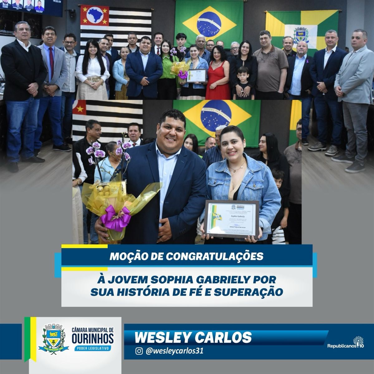 O impacto de sua trajetória foi reconhecido oficialmente pela Câmara Municipal de Ourinhos. Em agosto de 2025, durante a 27ª Sessão Ordinária, o vereador Wesley Carlos apresentou uma Moção de Congratulações em homenagem à jovem, destacando sua história de fé, coragem e superação. Na ocasião, Sophia esteve presente no plenário, acompanhou a homenagem emocionada e teve seu testemunho exibido em vídeo.