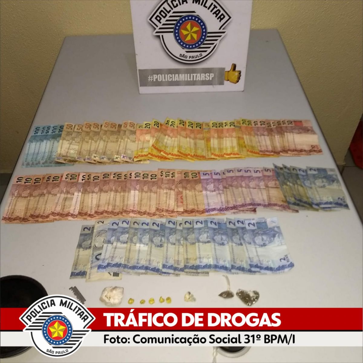 “Denuncia tráfico de entorpecentes pela Rua Angelo Perucci 238. Com a chegada das equipes, um indivíduo não identificado se evadiu, ato contínuo as equipes adentraram a residência, onde abordaram 01 pessoa portando uma porção de maconha, e em buscas na residência foram localizados 7 pedras de crack embaladas individualmente para venda, 1 pedra bruta de crack, bem como 1 porção de maconha, e a quantia de 1.632 reais em notas diversas”, destacou os PMs.
