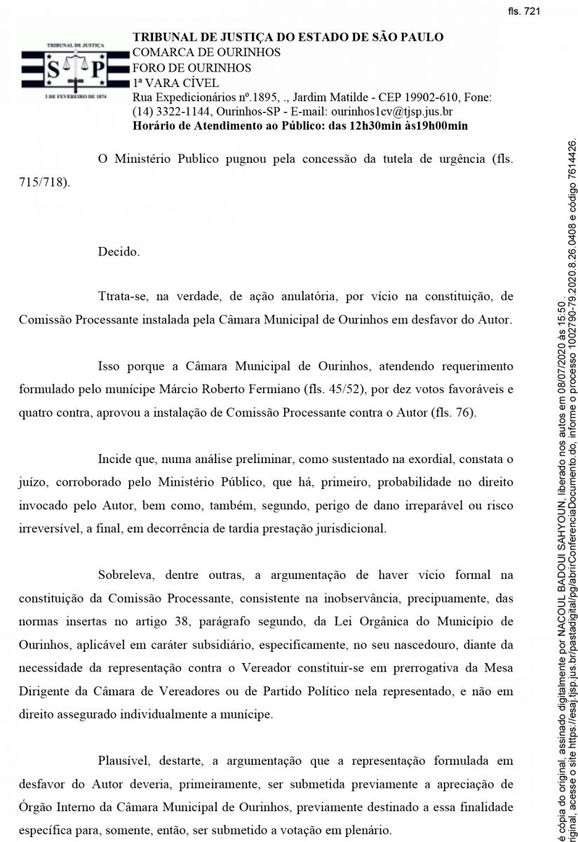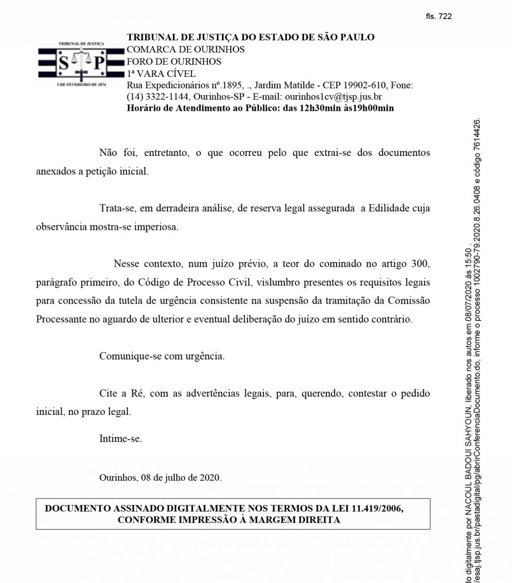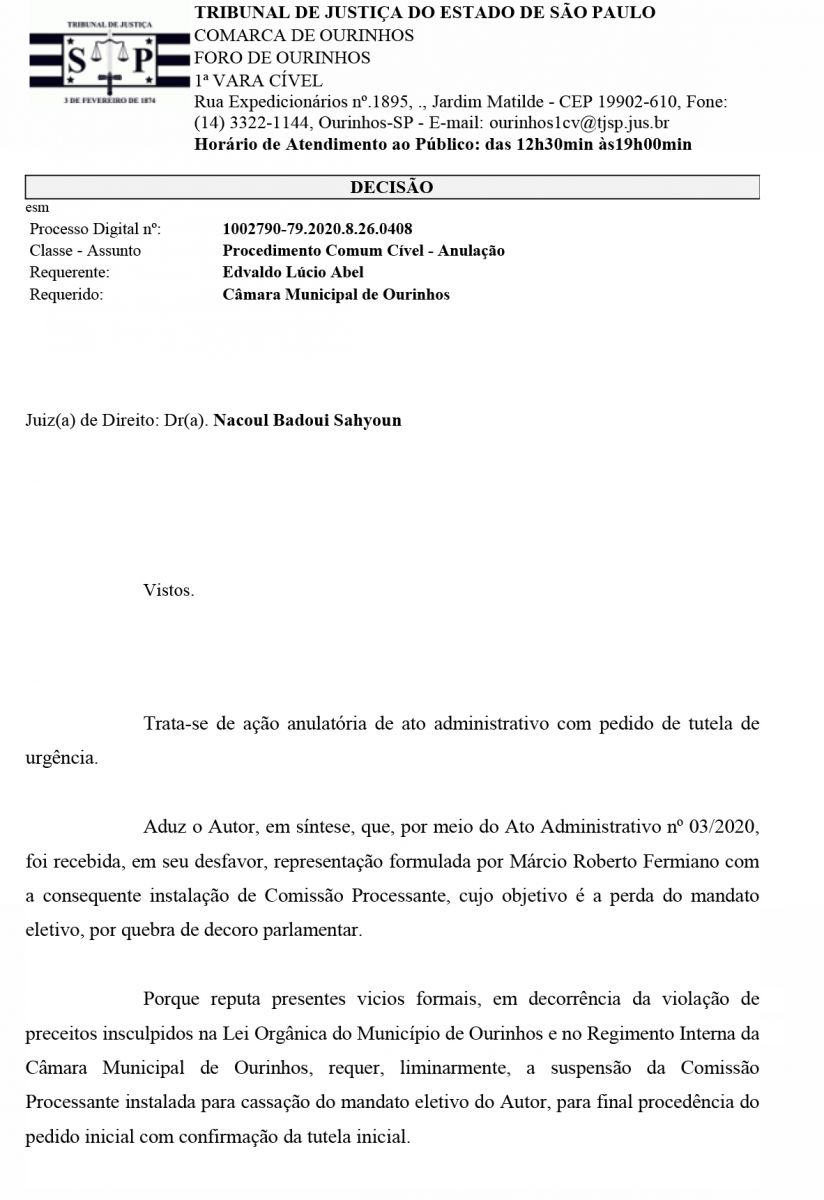 O Juiz de Direito da 1ª Vara Cível de Ourinhos, Dr. Nacoul Badoui Sahyoun, acatou, nesta quarta-feira, 8, a ação anulatória, por vício na constituição, da CP (Comissão Processante) instalada pela Câmara Municipal de Ourinhos contra o vereador Edvaldo Lúcio Abel “Vadinho” (PSDB). Com isso fica suspensos os trabalhos da CP, que foi aprovada por 10 votos a 4, no dia 16 de junho e é formada pelos vereadores Salim Mattar (PSDB), Flávio Luis Ambrozim (PL) e Éder Mota (MDB).