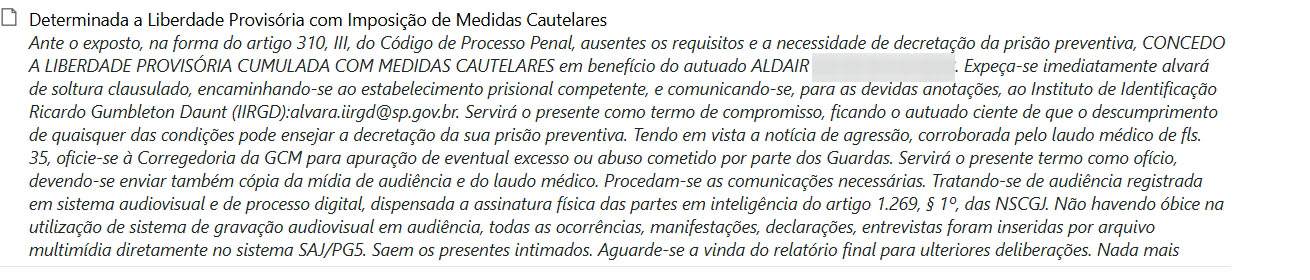 Na decisão, o magistrado afirmou que, com base no artigo 310, inciso III, do Código de Processo Penal, não estavam presentes os requisitos para a decretação da prisão preventiva. Por isso, concedeu a liberdade provisória mediante medidas cautelares, ressaltando que o descumprimento das condições impostas poderá resultar na decretação de nova prisão. O alvará de soltura foi expedido imediatamente, com comunicação aos órgãos competentes e ao Instituto de Identificação Ricardo Gumbleton Daunt (IIRGD). O processo seguirá em tramitação e aguarda a conclusão do relatório final para novas deliberações.