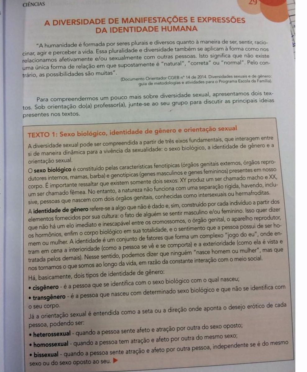 A apostila explica os conceitos de sexo biológico, identidade de gênero e orientação sexual. Também traz orientações sobre gravidez e doenças sexualmente transmissíveis.