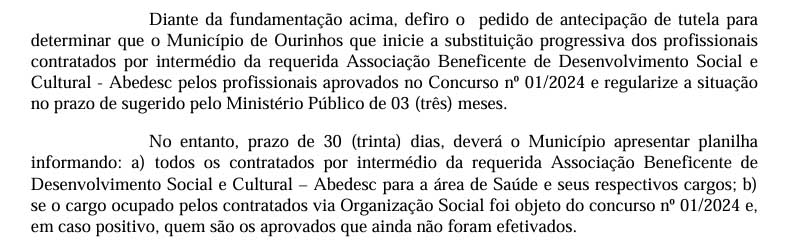 Na decisão, a juíza destacou que os documentos apresentados comprovaram a substituição de concursados por terceirizados, o que viola o princípio da legalidade e da moralidade administrativa. Por isso, determinou que, no prazo de 30 dias, o Município apresente uma planilha detalhada com os profissionais contratados via Abedesc e os respectivos cargos, informando se esses cargos estão contemplados no edital do concurso nº 01/2024. Além disso, a Prefeitura terá três meses para iniciar e concluir a substituição progressiva desses contratos por servidores efetivos.