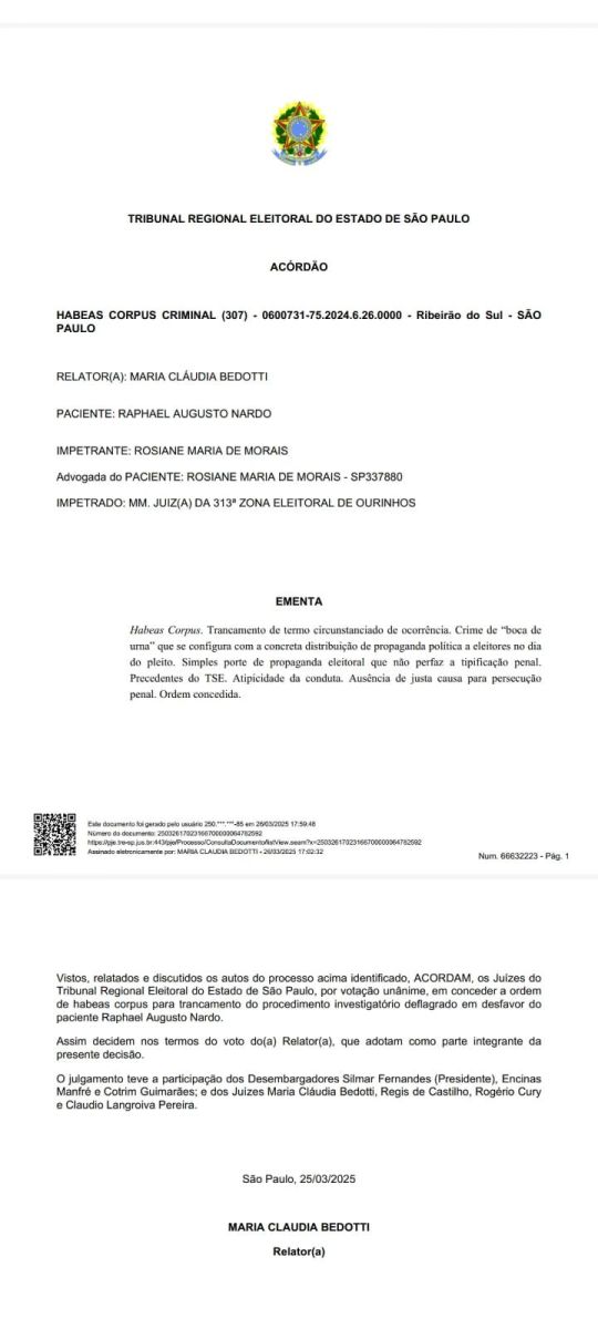 O Tribunal Regional Eleitoral de São Paulo (TRE-SP) decidiu, por unanimidade, anular a prisão do vereador, e presidente da Câmara de Ribeirão do Sul (SP), Raphael Nardo (PP), ocorrida no dia das eleições municipais de 2024. Em votação unânime, os sete desembargadores da corte determinaram o imediato trancamento do processo, no qual o candidato à reeleição era acusado de suposta prática de "boca de urna" durante a eleição na cidade.