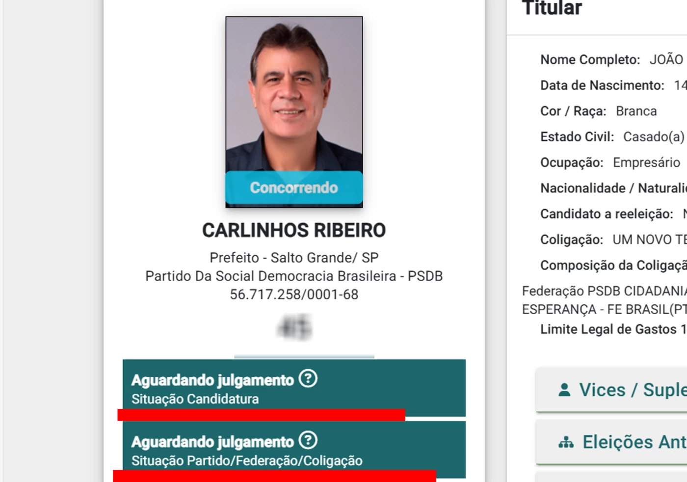 A Justiça Eleitoral poderá impugnar a candidatura de Carlinhos Ribeiro (PSDB), ex-prefeito de Salto Grande, que concorre à Prefeitura pelo PSDB, através da Federação PSDB/CIDADANIA, na coligação "Um Novo Tempo: Honestidade e Respeito". A ação, proposta pelo Ministério Público Eleitoral (MPE), questiona a regularidade da federação, apontando irregularidades no processo de formação da coligação.