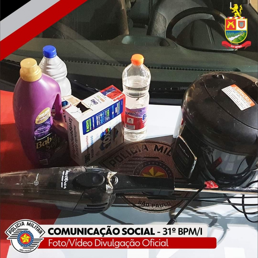 O ladrão já havia separado dentro de um saco de ração alguns objetos que iria furtar, como uma panela elétrica de fazer arroz, um aspirador de pó portátil, uma luminária LED e produtos de limpeza.