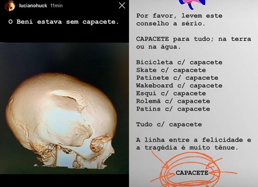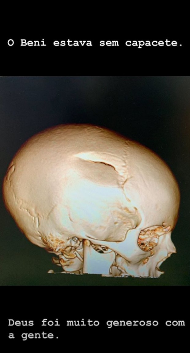 O apresentador revelou que Benício não usava equipamento de proteção durante o passeio que resultou no acidente: "O Beni estava sem capacete. Deus foi muito generoso com a gente", completou em outro post mostrando a imagem do afundamento craniano sofrido pelo garoto.