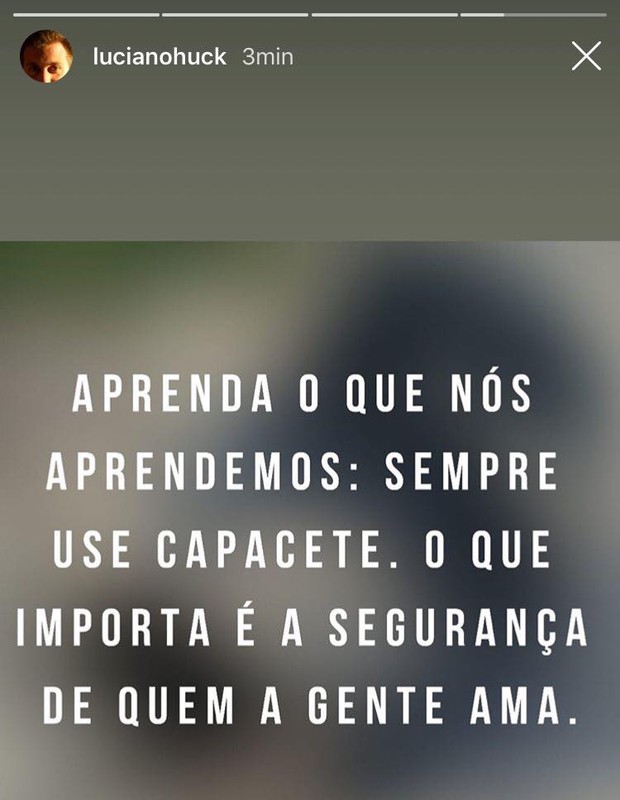 Luciano Huck fez um alerta para a importância do uso de capacetes durante a prática de atividades físicas após o grave acidente que o filho do meio, Benício, de 11 anos, sofreu no fim de semana. "Nosso filho foi socorrido depois de sofrer um acidente sério. Graças a Deus, aos médicos, a todas as orações de vocês. Nós demos sorte e não para contar com a sorte sempre", escreveu o apresentador, pai também de Joaquim, de 14 anos, e Eva, de 6, todos do casamento com Angélica.