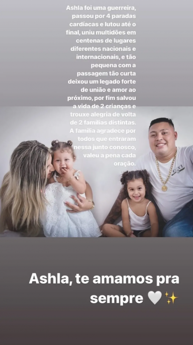 "Mesmo com uma passagem tão curta, deixou um legado forte de união e amor ao próximo. A família agradece por todos que entraram nessa junto conosco, valeu a pena cada oração", expressou Letícia em parte da mensagem. Ela também sugeriu que Ashla, mesmo após sua partida precoce, teria impactado positivamente a vida de outras crianças, indicando a possibilidade de doação de órgãos.